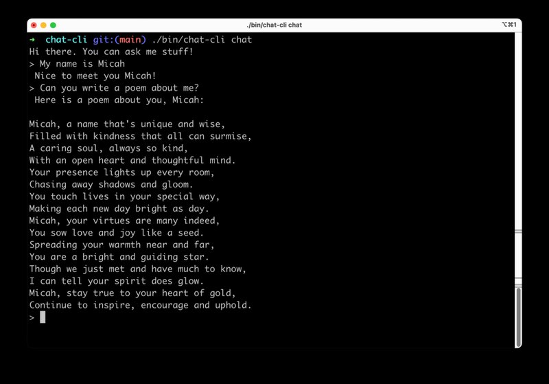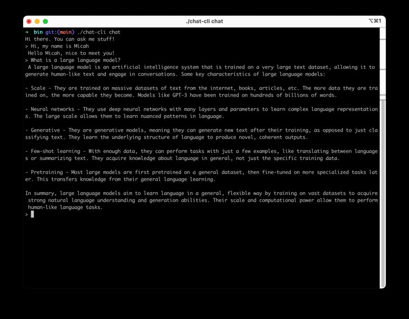 chat-cli is a project I've been working on for the past couple months. It started out as a way to kick the tires on the now publicly available Amazon Bedrock service, and also as a way for me to learn a bit more about Go, and the AWS SDK for Go version 2. Since then, it has turned into a bit of an exploration into command line interface design, which is pretty interesting to me!