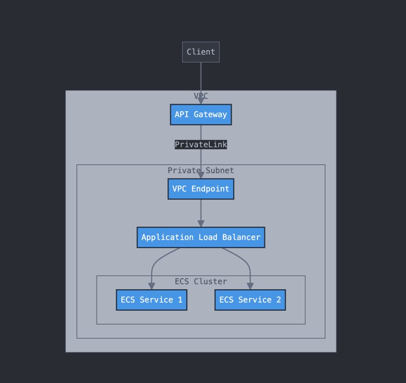 Me: Nice. Can you create an AWS Architecture diagram that shows a pattern for using an API Gateway to route requests securely to an Application Load Balancer in front of an ECS cluster?