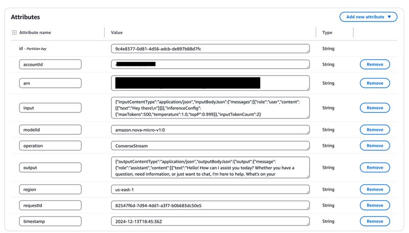 Amazon Bedrock logs are pretty robust. Each log shows the full turn by turn conversation that was sent as input to the model. It then shows the output from that invoke, as well as the number of tokens consumed for the request. With a chat scenario, these logs grow bigger and bigger over time, and they contain everything you need to reconstruct a chat later. In fact, you only need the most recent log, as it has the full conversation within the input context. So, the UUID is really a way for me to easily filter out all the old logs for the same conversation. It's a quick code update to the CLI client.