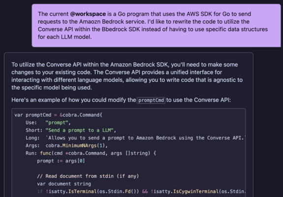 🧑💻 In this example, I'm asking Q to look across my code and suggest a strategy to modify what I've already written and use the new Converse API instead of how I did it originally.