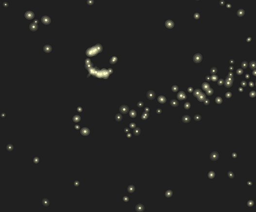 ✍ Prompt: "OK, new sketch. Let's create a background that is dark gray. On top, create some firefly like nodes that move with a fluidity based on my mouse movements"