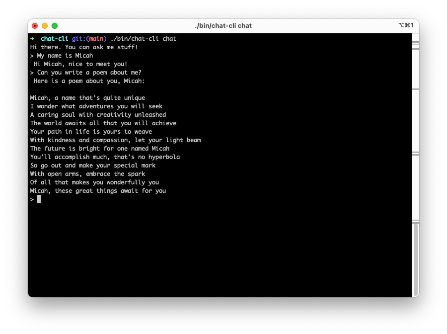 🚀 Completely revamped my little chat-cli program today to take advantage of the very awesome Cobra and Viper packages for building ClI programs in Go. Now chat-cli has "commands" like "prompt" and "chat" and "help."