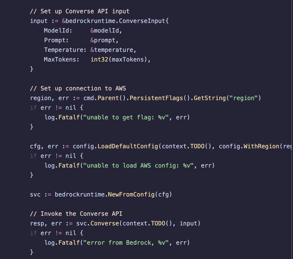 🧑💻 In this example, I'm asking Q to look across my code and suggest a strategy to modify what I've already written and use the new Converse API instead of how I did it originally.