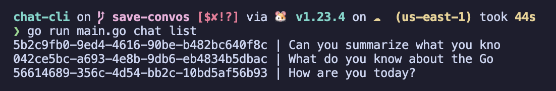 My little chat program can now save your chats with Amazon Bedrock LLMs and list them on the command line.