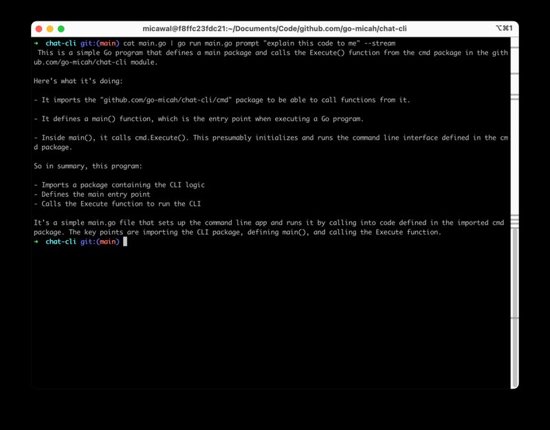 chat-cli is a project I've been working on for the past couple months. It started out as a way to kick the tires on the now publicly available Amazon Bedrock service, and also as a way for me to learn a bit more about Go, and the AWS SDK for Go version 2. Since then, it has turned into a bit of an exploration into command line interface design, which is pretty interesting to me!