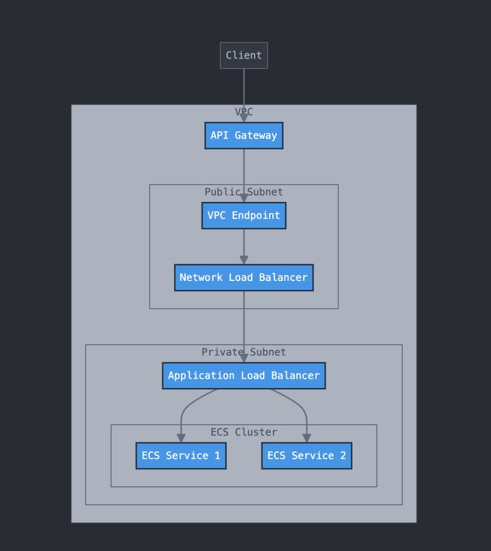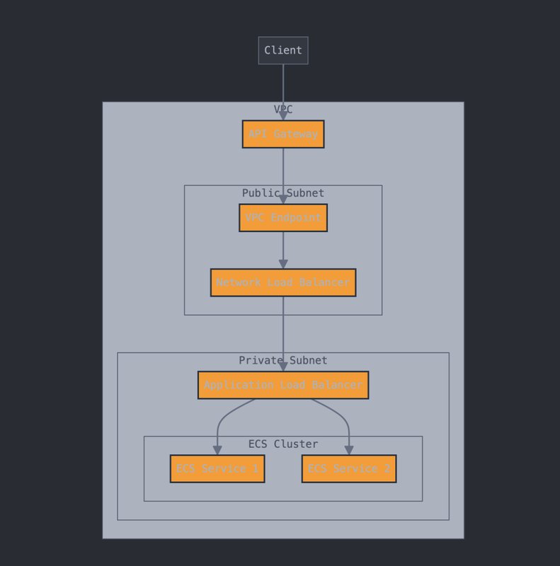 Me: Nice. Can you create an AWS Architecture diagram that shows a pattern for using an API Gateway to route requests securely to an Application Load Balancer in front of an ECS cluster?